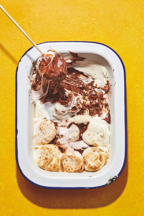 - For the s’mores dip, place the chocolate on the bottom of a heatproof dish, then scatter the marshmallows on top in an even layer, making sure they fully cover the chocolate. Air-fry at 160°C for 5–6 minutes until gooey and melted.