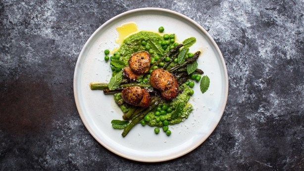 Donal's scallops with green peas and asparagus