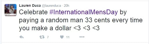 No beating around the bush there. And she’s entitled to her opinion. The problem with this kind of narrative, though, is that it detracts from the very real, important issues that International Men’s Day is striving to highlight; instead it turns the focus to ‘men versus women’, which is never helpful, and only serves to strengthen the misguided stereotype that all feminists are misandrists.