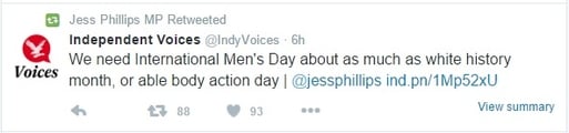 Meanwhile, UK Labour Party MP Jess Phillips wrote an article for The Independent (UK) in which she stated: “We need International Men’s Day about as much as white history month, or able body action day.” (This statement, being wonderful click-bait, of course went on to become the article’s headline and Twitter lead-in.)