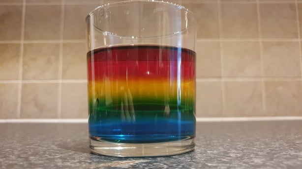 What’s going on? "By adding salt to the water, we’re changing the density to make the water heavier," explains Sleet. "So when we layer the different coloured liquids, the liquids we added lots of salt to will be very dense and sink to the bottom, while the liquids with less salt float on top. There’s a bit of mixing between the layers, which helps to give us this great rainbow effect."