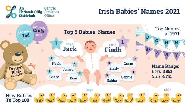 Jack has once again topped the list of names registered with the Central Statistics Office for baby boys in 2021, a position it has held every year but one since 2007.