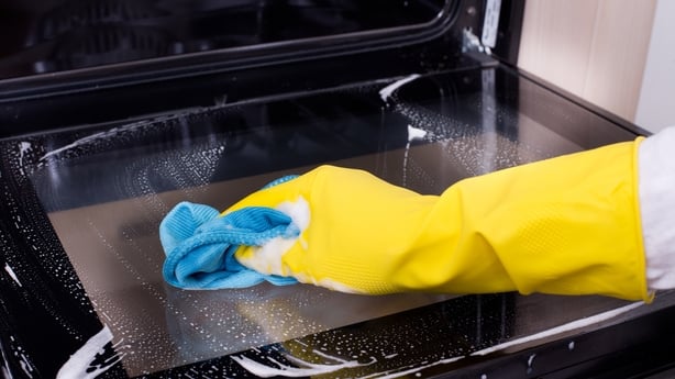 Use warm, soapy water and a non-abrasive sponge to gently wipe away the dirt. She says to then use a microfibre cloth and a glass cleaning spray on the front of your oven door to see how it sparkles. Ta-dah!