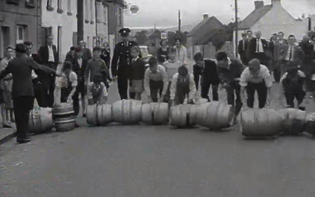 Young men lined up with the barrels to roll them through the streets of Nenagh. The winner is John Talbot who raises his barrel in the air to celebrate.