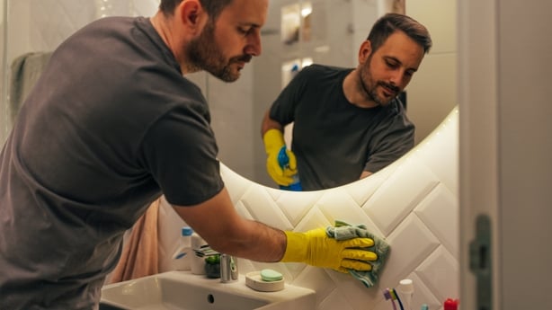 "Spray shower doors with white vinegar, leave 10 minutes, rinse. Wipe taps with a lemon half to tackle limescale. Wash bath mats and hand towels.