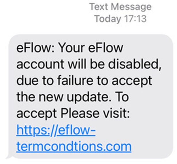 eFlow has advised anyone who receives a text message regarding unpaid tolls to ignore the message and not to open any links. eFlow does not ask customers to open any links to confirm payment details;