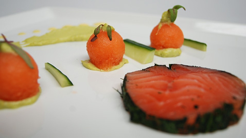 - To serve, cut the salmon into thin slices and remove the cling film. Place one slice, just off centre on the plate. Place three dollops of avocado purée on the side and put one melon ball on top of each. Place a couple of shards of cucumber in between and lastly garnish each melon ball with some more purée and a baby red chard leaf. Sprinkle the plates with a little sea salt and serve immediately.