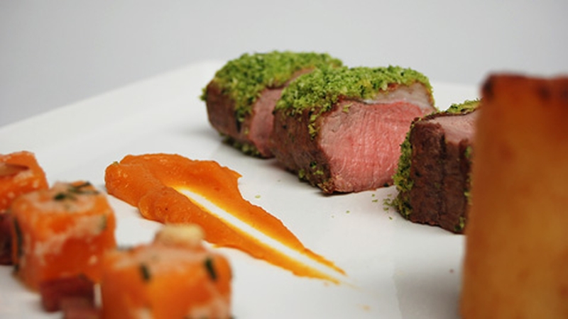- For the lamb, heat the oil on a pan and sear the loins over a high heat for about 2 minutes each side. Transfer to an oven dish and cook in the pre-heated oven for 6-8 minutes. Take the lamb out and set aside to rest. It should be rare to medium rare. Next blend the parsley and breadcrumbs until you have a bright green crust. Season the seared lamb with salt and pepper. Spread some mustard over the skin and coat with the parsley crust and cut each loin into 3 slices.