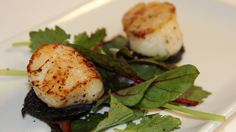 To serve, place the dressed leaves on your plate, then arrange two of the black pudding discs on top before each slice is topped with a scallop.