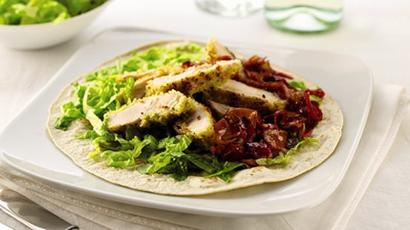 - Serve the chicken sliced on a warmed Mediterranean wrap with some of the shredded lettuce. Top with the mango sauce.