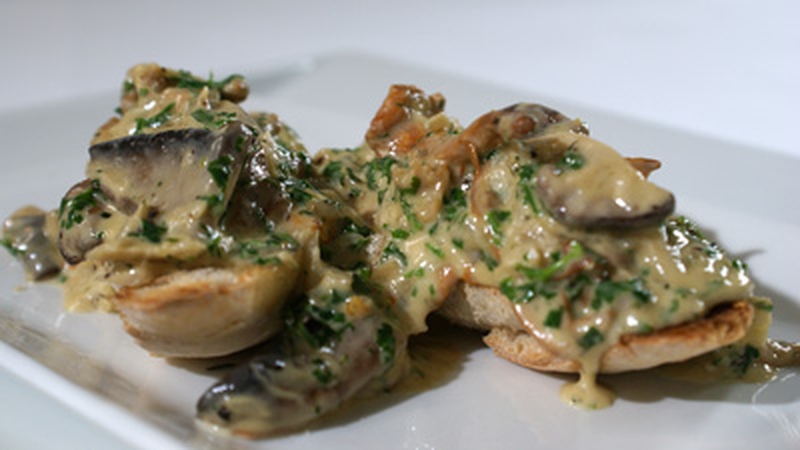 - Put 32 slices of bread on a serving dish and spoon the mushroom mixture on top.