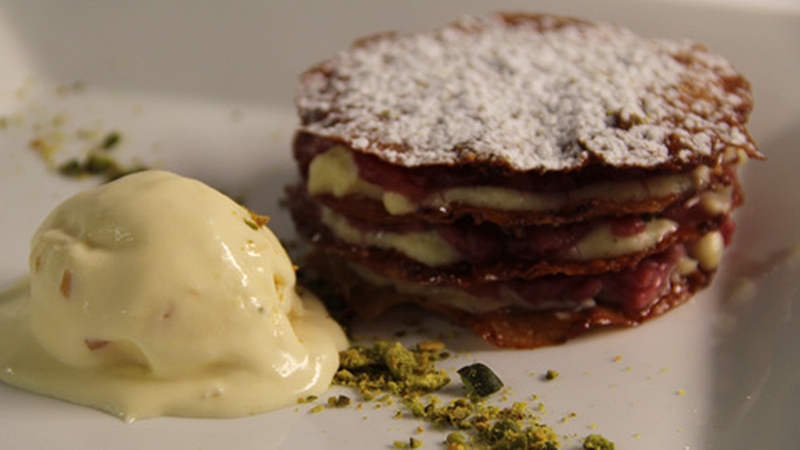 - Repeat again, finishing with a final layer of pastry on top. Dust with icing sugar and sprinkle the candied pistachios on the plate and top with a scoop of the candied ginger and mascarpone ice cream. Serve immediately.
