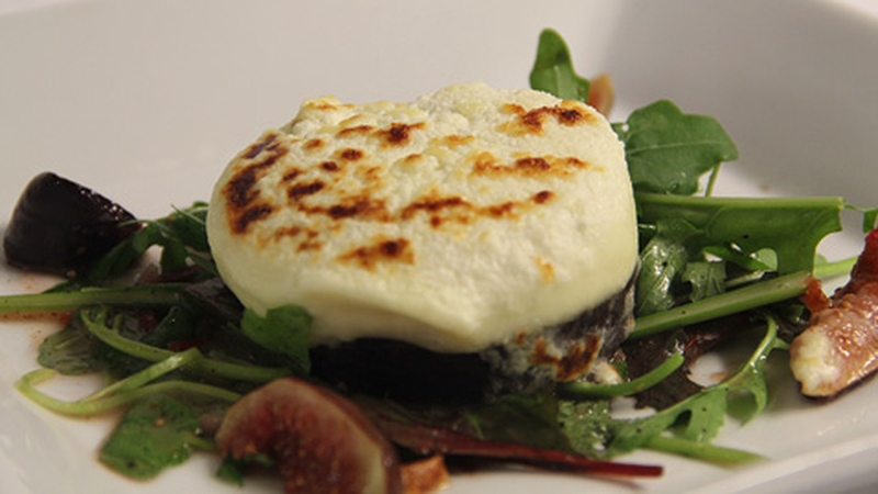 - Place some of the dressed salad in the centre of you plate; arrange a few fig slices on the plate and place the melted goat's cheese and black pudding on top. Serve immediately.