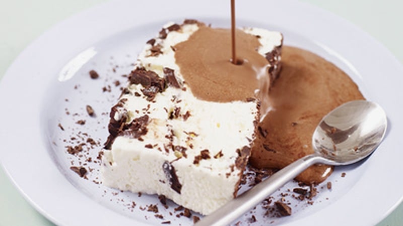 - Once it is set, carefully remove the semifreddo from the tin, turning it upside down onto the plate, and remove the parchment or cling film. Cut into slices, using a warm knife if necessary and serve with a drizzle of chocolate sauce.