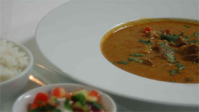 - When the meat is tender remove from heat and sprinkle with chopped coriander. Serve with rice and pineapple salad.
