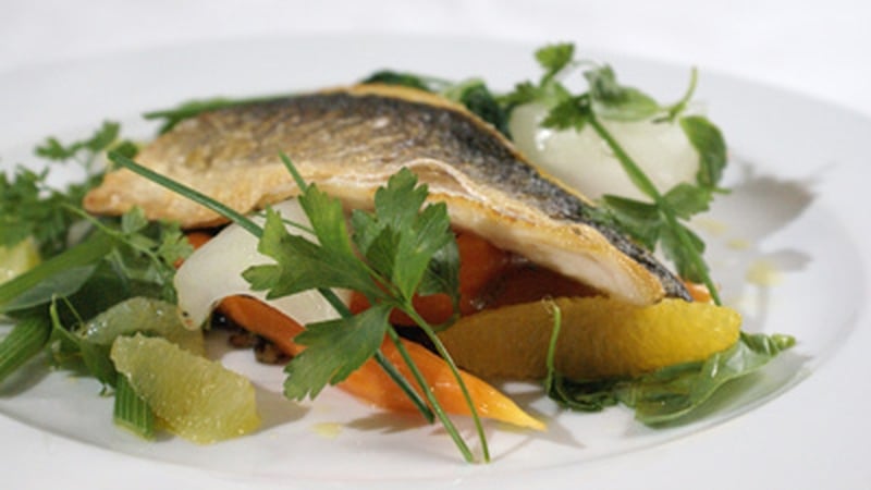 - Garnish with the baby vegetables and drizzle the dressing around using some of the citrus segments.