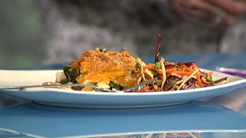 - Lay the remaining sliced butternut squash on top seasoning as you go.