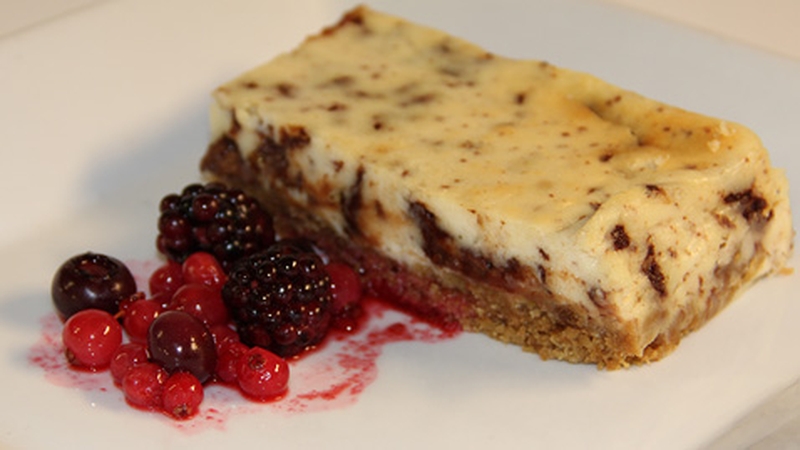 - To serve, cut a rectangle from the cheesecake and serve on a plate with the winterberry compote.