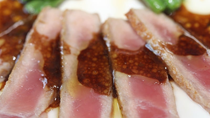 - On the plate, sparingly place the balsamic reduction (make a little design if you’re up to it). Stack two French bean wraps and place about 4 thinly sliced pieces of tuna on the plate opposite the French bean wraps. Have the tuna slices overlapping slightly.