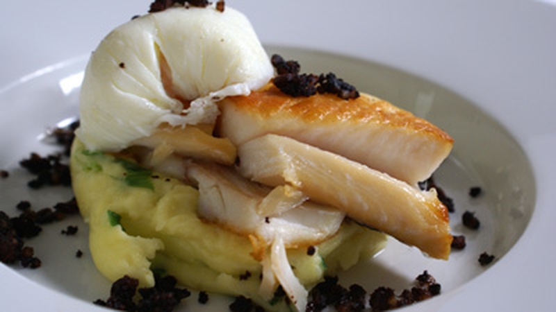 - Remove the Clingfilm from the eggs and place on the haddock and sprinkle the dish with some crumbled black pudding.