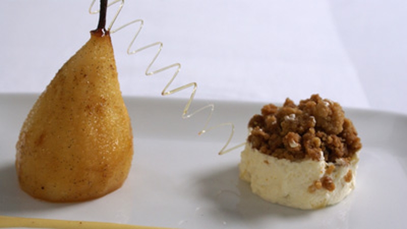 - Place a warm pear on a plate, put some ginger cream on the side and sprinkle the crumble on top.