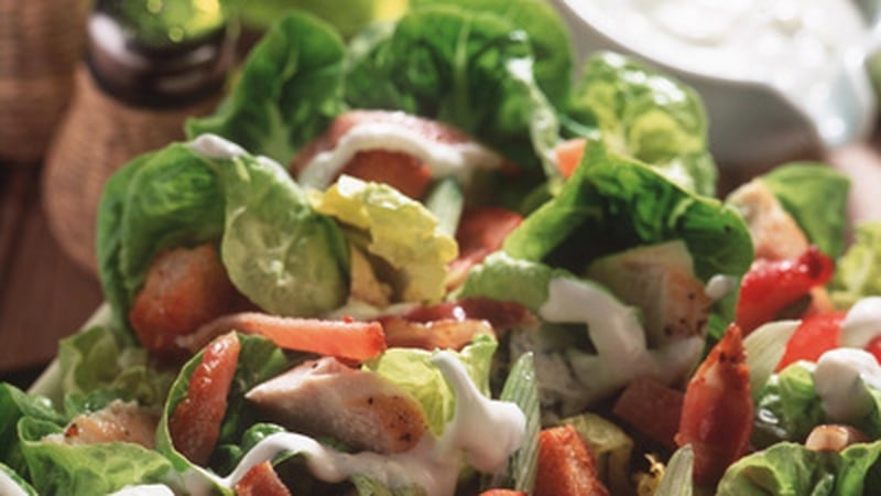 - Toss all the other salad ingredients together, add the vinegar and some olive oil, mix in the croutons lightly and spoon into the centre of the bread.