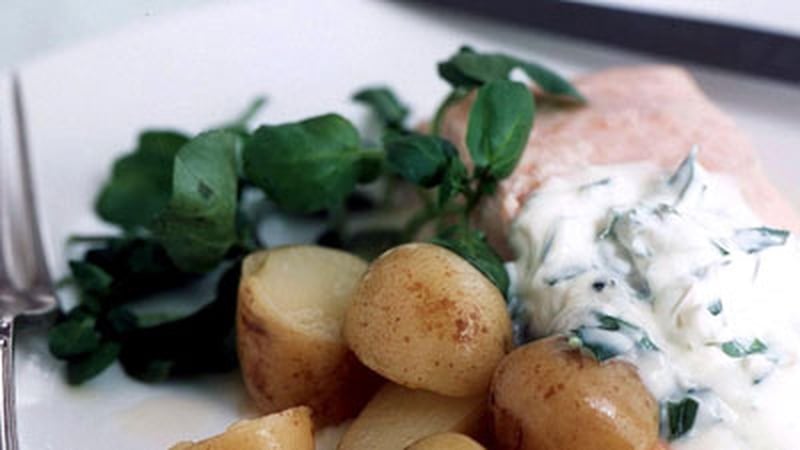- Remove the cheese and onion potato from the mould and place on a warm plate. Using a large spoon or spatula, put the salmon dish on the plate.
