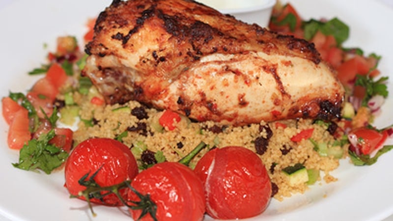 - To serve, place couscous on a plate with a chicken breast on top. Place salsa around the couscous and serve the yogurt dip in a small bowl on the side of the plate