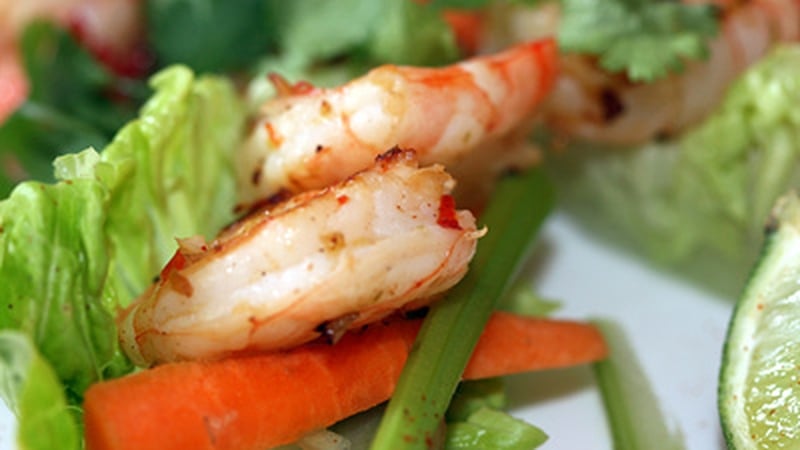 - To serve place 3 lettuce leaves on a plate and place some prepared vegetables in each lettuce leaf with 2 prawns, repeat on 4 plates along with 4 dipping bowls of Chilli jam. Decorate with fresh coriander and a sprinkling of paprika.