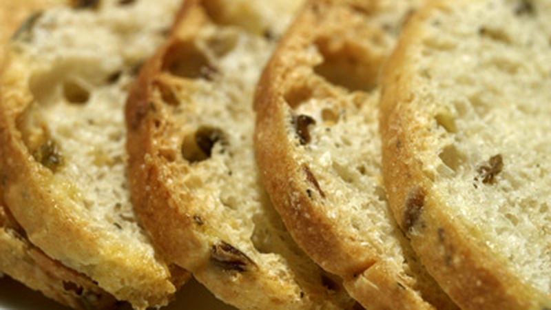 - Slice the ciabatta, rub with some chopped garlic, drizzle with olive oil and bake until golden at 180°C.