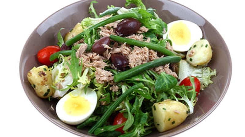 - Mix all the veg, olives and herbs with the dressing. Place tuna, all the veg that has been placed in ring, season egg and finish with crouton.