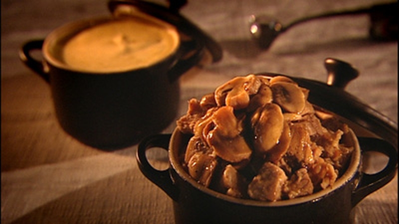 - Then fry a few mushrooms until they are golden brown and place them on top. Then you can either put the lids on the little casseroles and serve them like that, or you can put a little of the sauce over them. The quantity does not seem great, but the whole point is the lovely creamy sauce, which people pour over as much as they want.