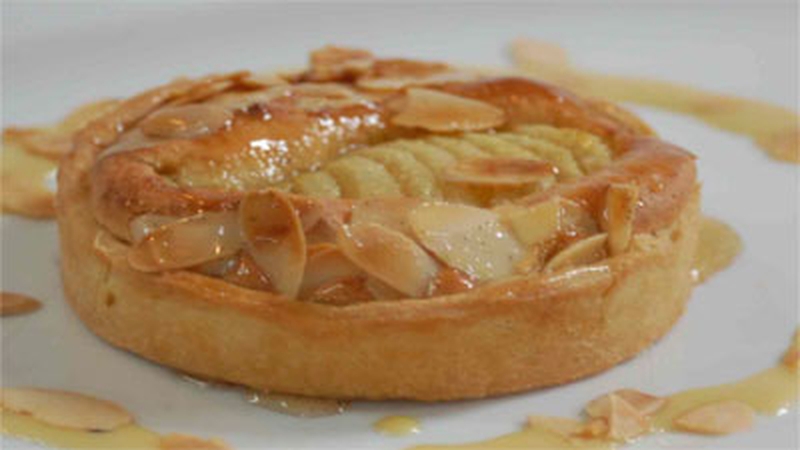 - To make the almond filling, whisk the butter, sugar and eggs until thick and smooth. Then add the ground almonds and flour and beat until smooth. Pour the mixture into the pastries. Cut the pears in half lengthways and slice thinly. Place the pears onto the almond mixture and sprinkle with flaked almonds. Bake in the oven for 30-40 minutes until golden on top. Serve warm.