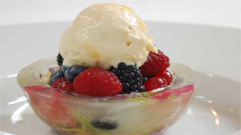 - Place the berries ina bowl and sprinkle with the sugar and drizzle with Champagne. Place the berries and some of the juices in the ice bowl and place some ice cream on top. Serve immediately.