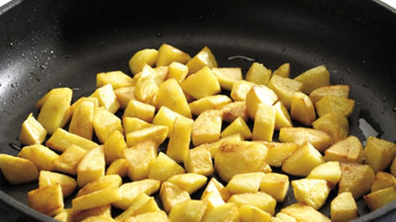 - Add the diced cooked potato and fry until the potato becomes brown at the edges. Add the vegetables and season with salt and pepper and stir in any herbs at this stage.
