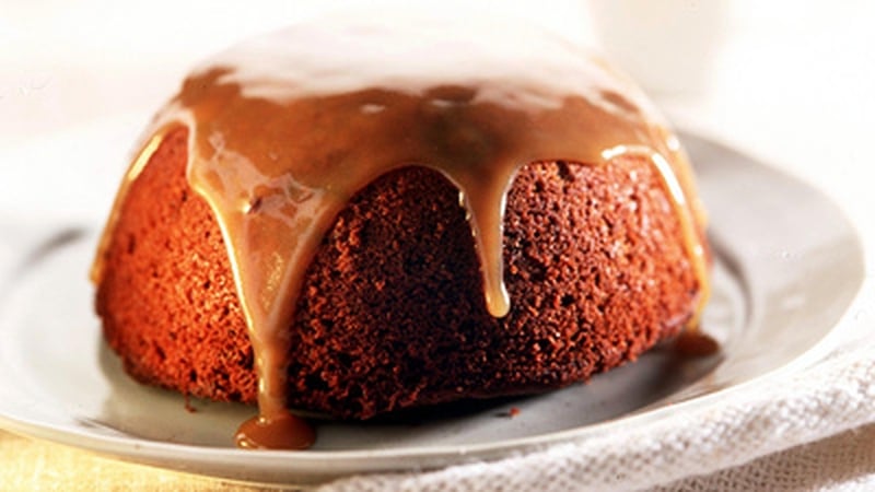 - Clip the side back on the cake tin and pour half the toffee sauce on to the bottom half of the cake.