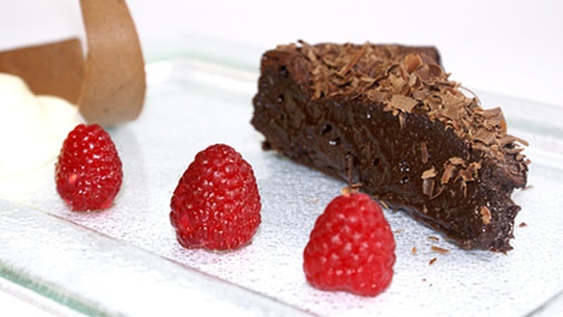 - To serve, cut a slice of cake and dust with cocoa powder and garnish with ice cream scoop and some fresh raspberries.