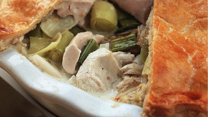 - If you have made the béchamel in advance, heat it up in a saucepan before pouring it over the chicken and leek mixture. Top with the rolled out piece of puff pastry and cut off any excess.