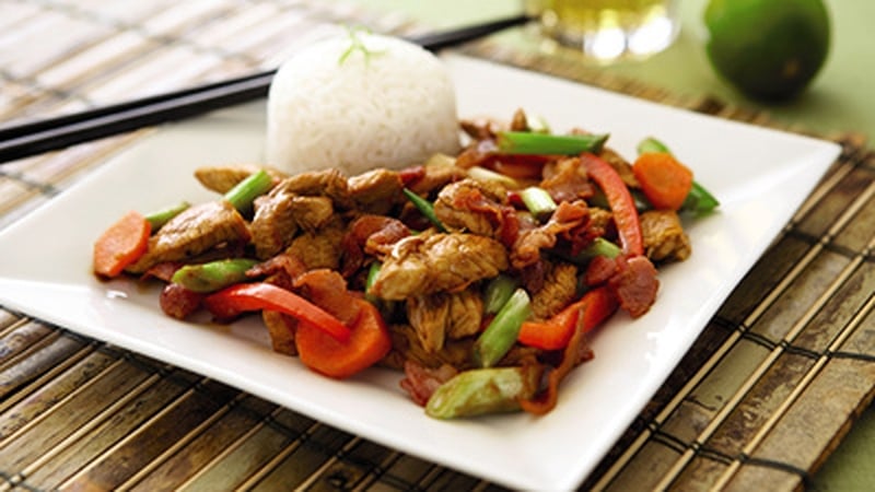 - Heat 2 tbs oil in a wok, or frying pan, until very hot and stir-fry the bacon.