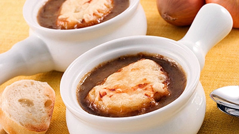 - Preheat the grill. Cut the baguette into 2cm slices and toast it on both sides. Pour the soup into ovenproof bowls, place 1 or 2 pieces of baguette on top and sprinkle generously with the grated gruyere.