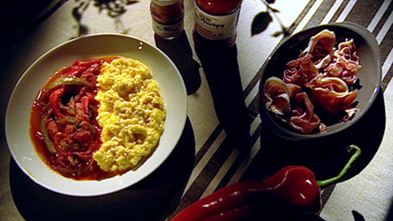 Try this rustic pepper, garlic and tomato stew, served with eggs and ham.