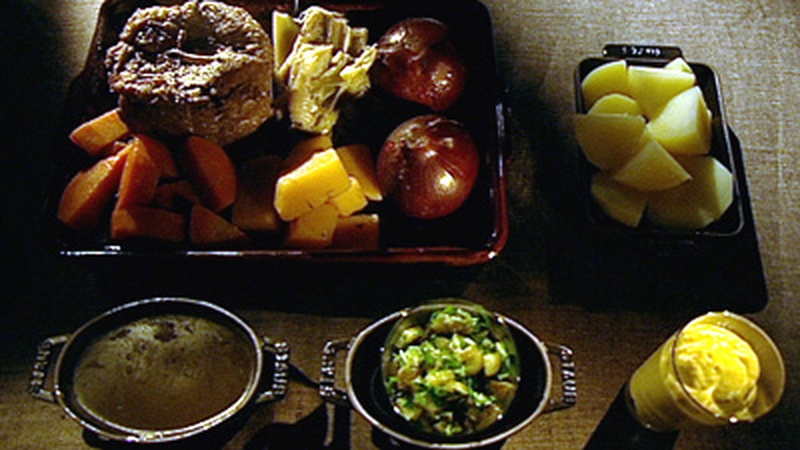 - Serve the bouillon in soup bowls, then, in large, deep dishes serve the meat, vegetables and marrow bones, with a little bouillon poured over, accompanied by mustard, cornichons and gros sel.