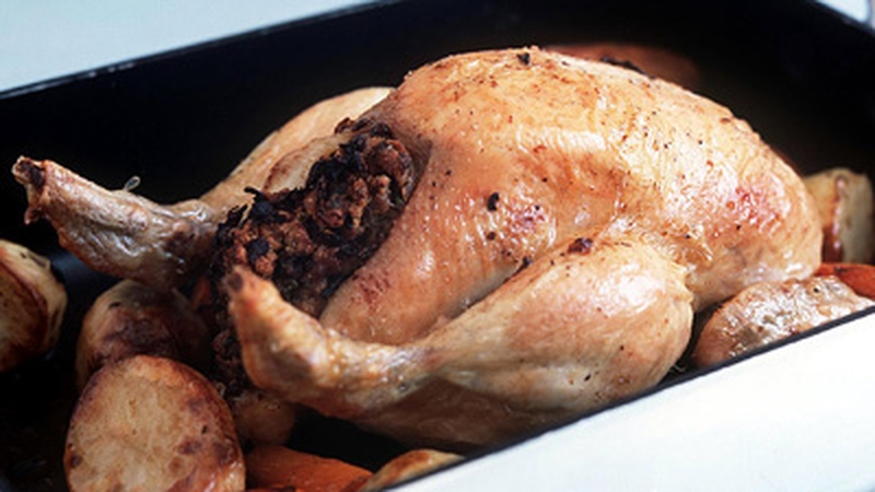 - Begin by searing the chicken all over in a pan with a mixture of oil and a little butter. When nicely coloured, transfer to an oven dish and roast at around 200°C for around an hour or until the juices run clear.
