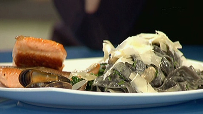 - To present this dish, curl the pasta with a fork and place to one side of the plate and spoon a little more of the sauce and shellfish over. Place the spinach on the opposite side with the trout on top. Garnish with a little shaved parmesan.