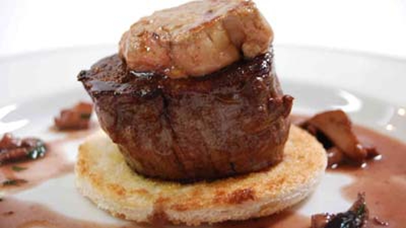 - Toast the bread until golden and place on the serving plates. Put the steak on top of the toasted bread and put the seared foie gras on top. Sprinkle some mushrooms around the dish and drizzle with the red wine jus. Lastly garnish with some black truffle shavings.