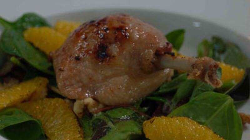 - Place some dressed salad on a serving dish, and put a duck leg on top. Serve immediately.