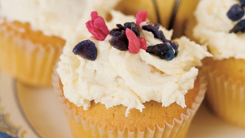 - When the cupcakes are cool, spread a generous heaped teaspoon of lemon butter icing over the top of each one. Decorate with the crystallised flowers (if using).