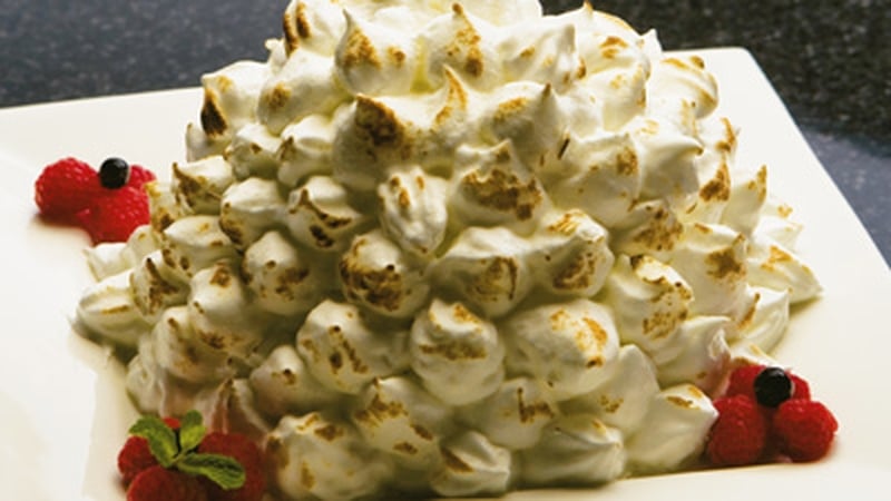 This sponge cake covered with ice cream and meringue is the perfect dessert for a special occasion.
