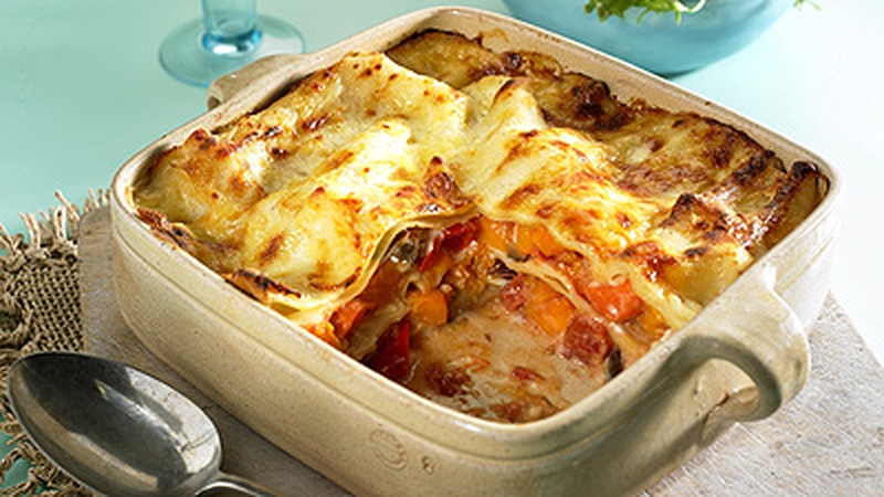 - Spread a thin layer of sauce in a 9 in x 12 in lasagne dish. Cover with a layer of lasagne.