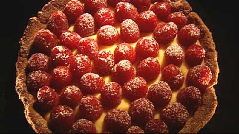 - Cook it for about 15 minutes and then let it cool. Fill the tart with the crême patissière, which is now a nice, thick custard. Smoothe it out and then cover it with raspberries. Pack the berries in nice and tightly and dust them with icing sugar and there we are.